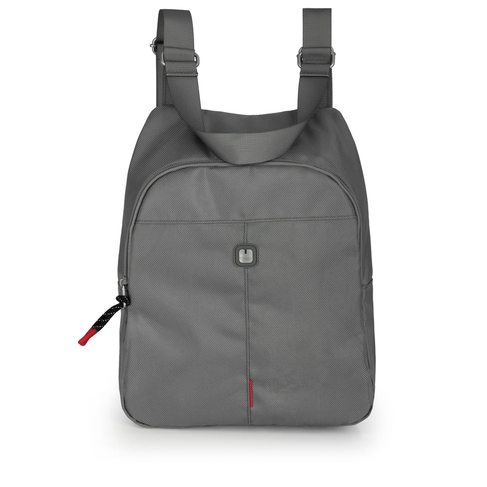 Mochila bolso con apertura trasera, impermeable, de poliéster gris. Fabricada con materiales libres de PVC.